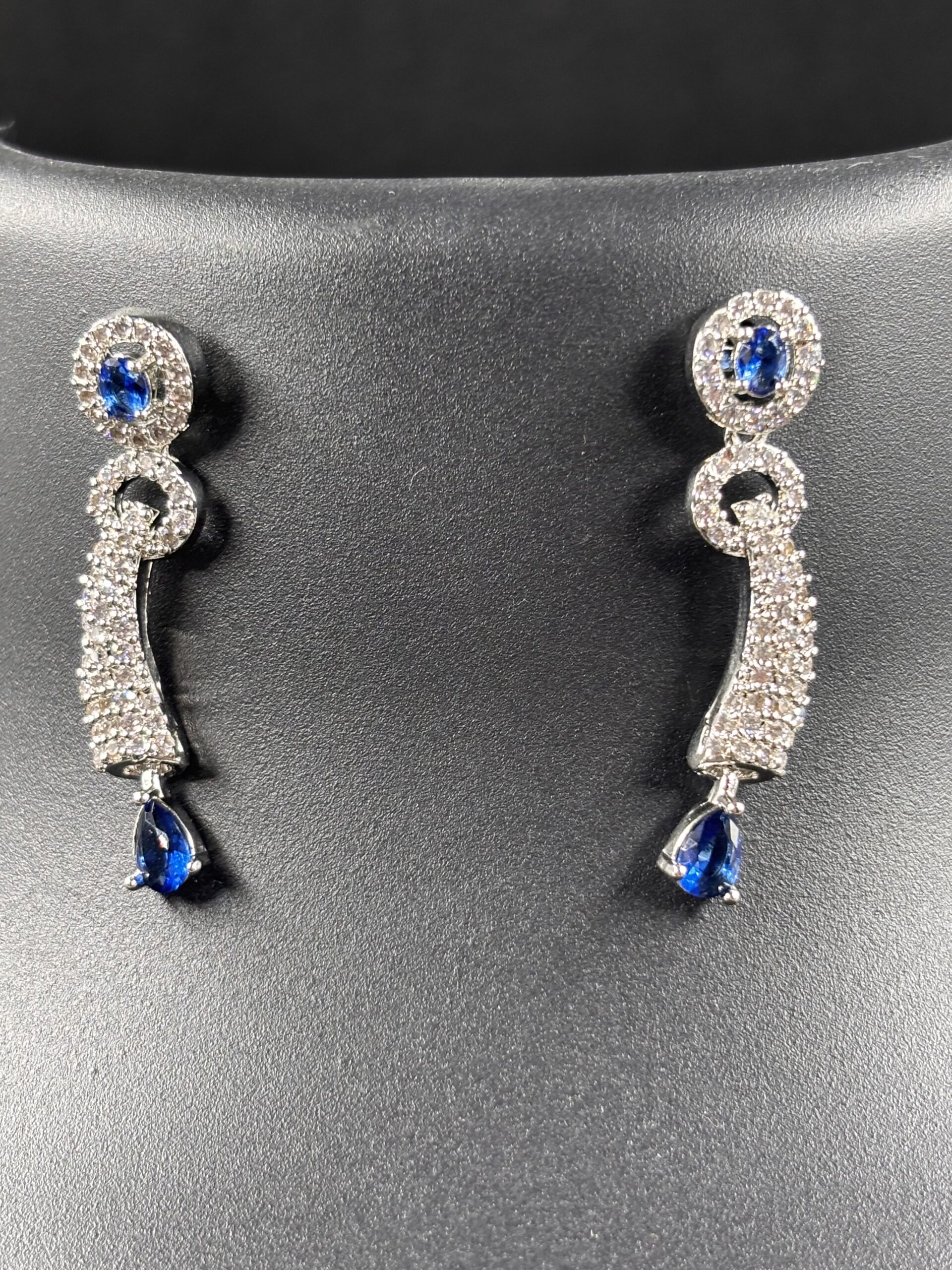 The matching earrings mirror the necklace design with curved crystal-studded forms and suspended blue teardrop crystals, adding movement and brilliance with every wear. Crafted in premium silver-tone imitation metal, this set offers a perfect balance of elegance and modern charm.