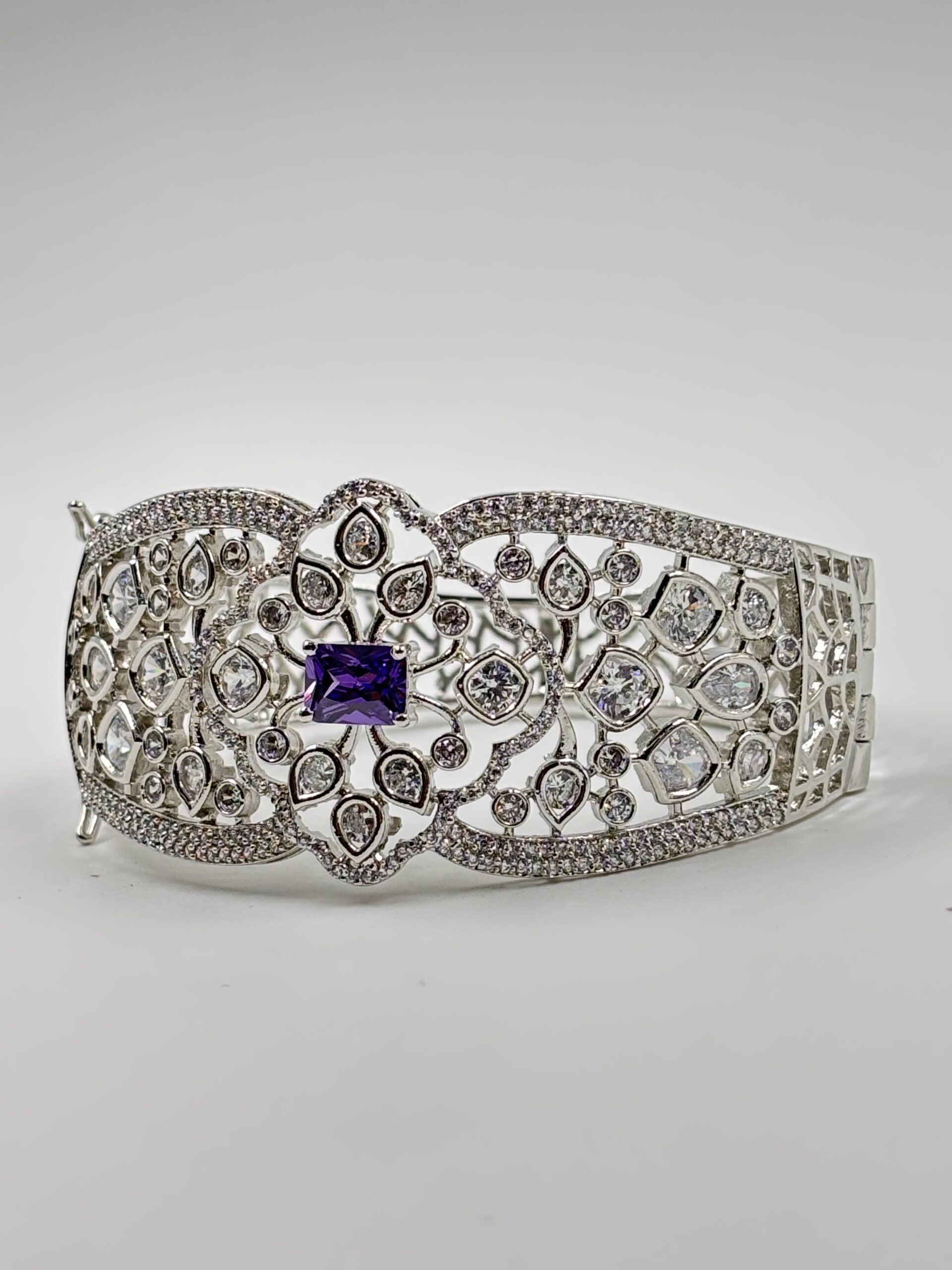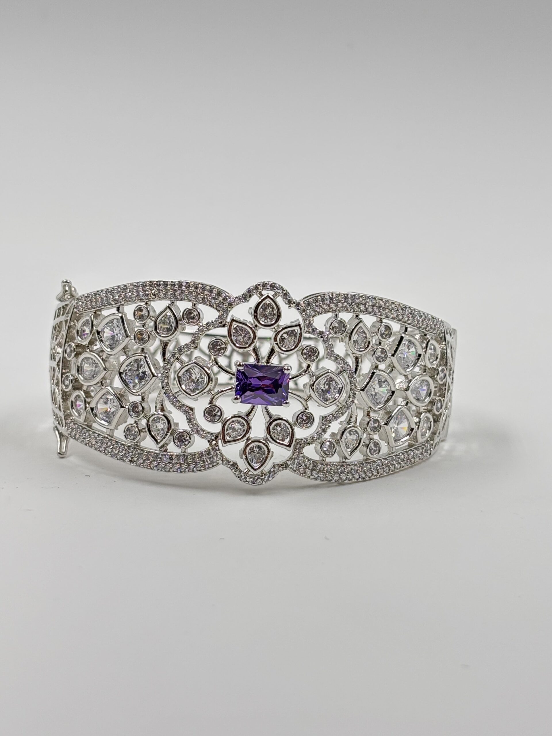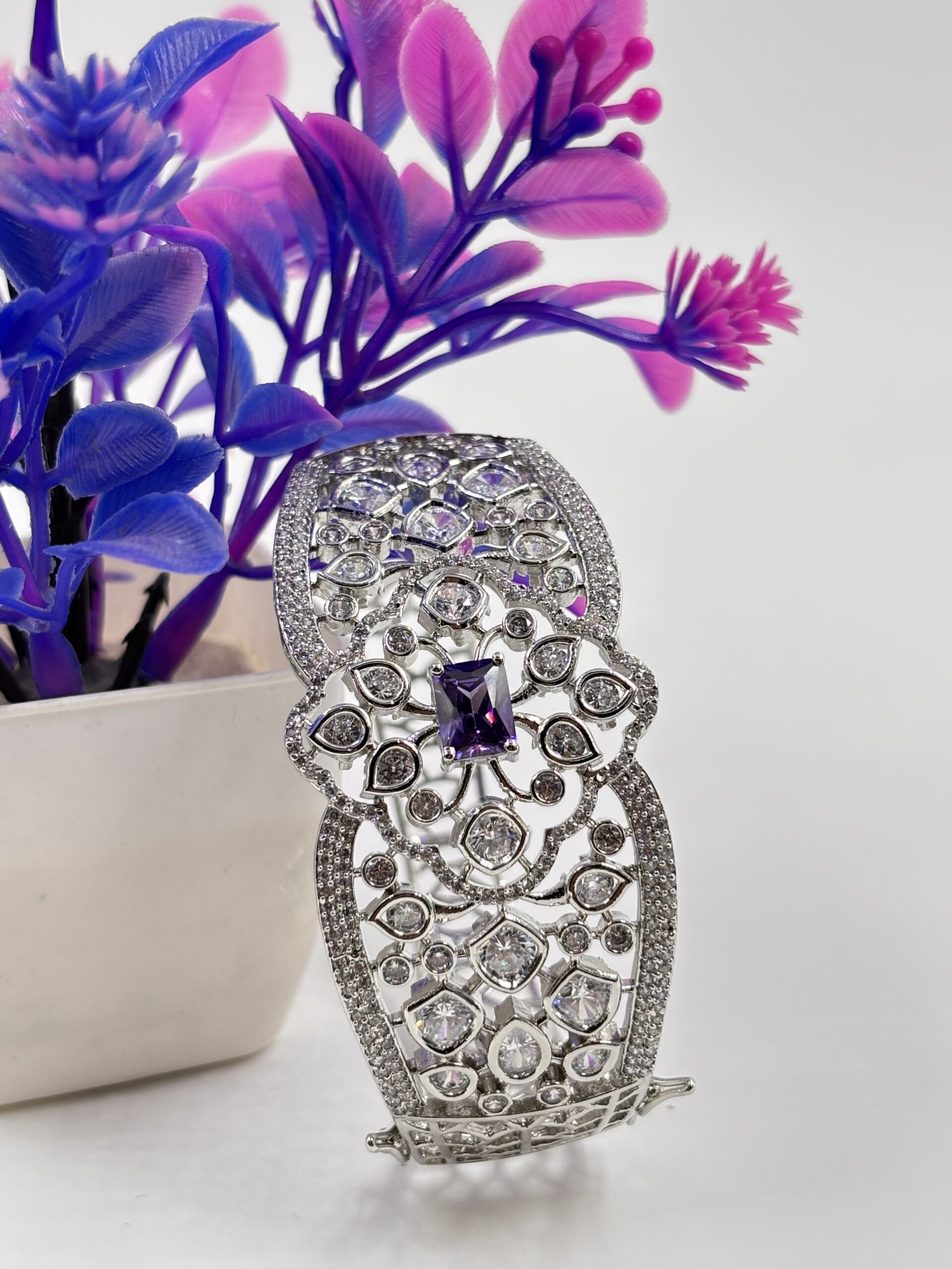 Elevate your jewellery collection with this exquisitely crafted Silver-Tone Purple Stone Floral Cutwork Statement Bangle. Designed with an intricate openwork floral pattern, this rigid bangle features a striking rectangular-cut purple stone centerpiece, surrounded by shimmering crystal accents that enhance its luxurious appeal.