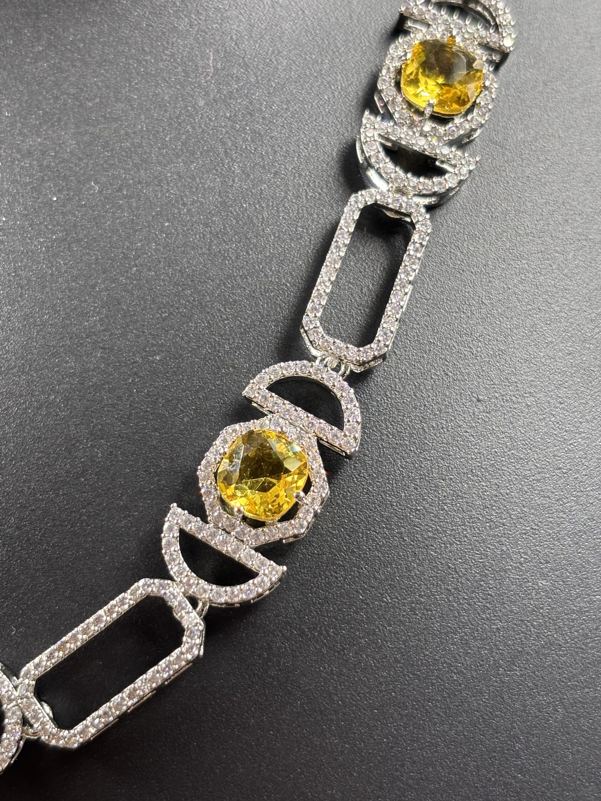 • Oval and rectangular-cut yellow stones with crystal accents