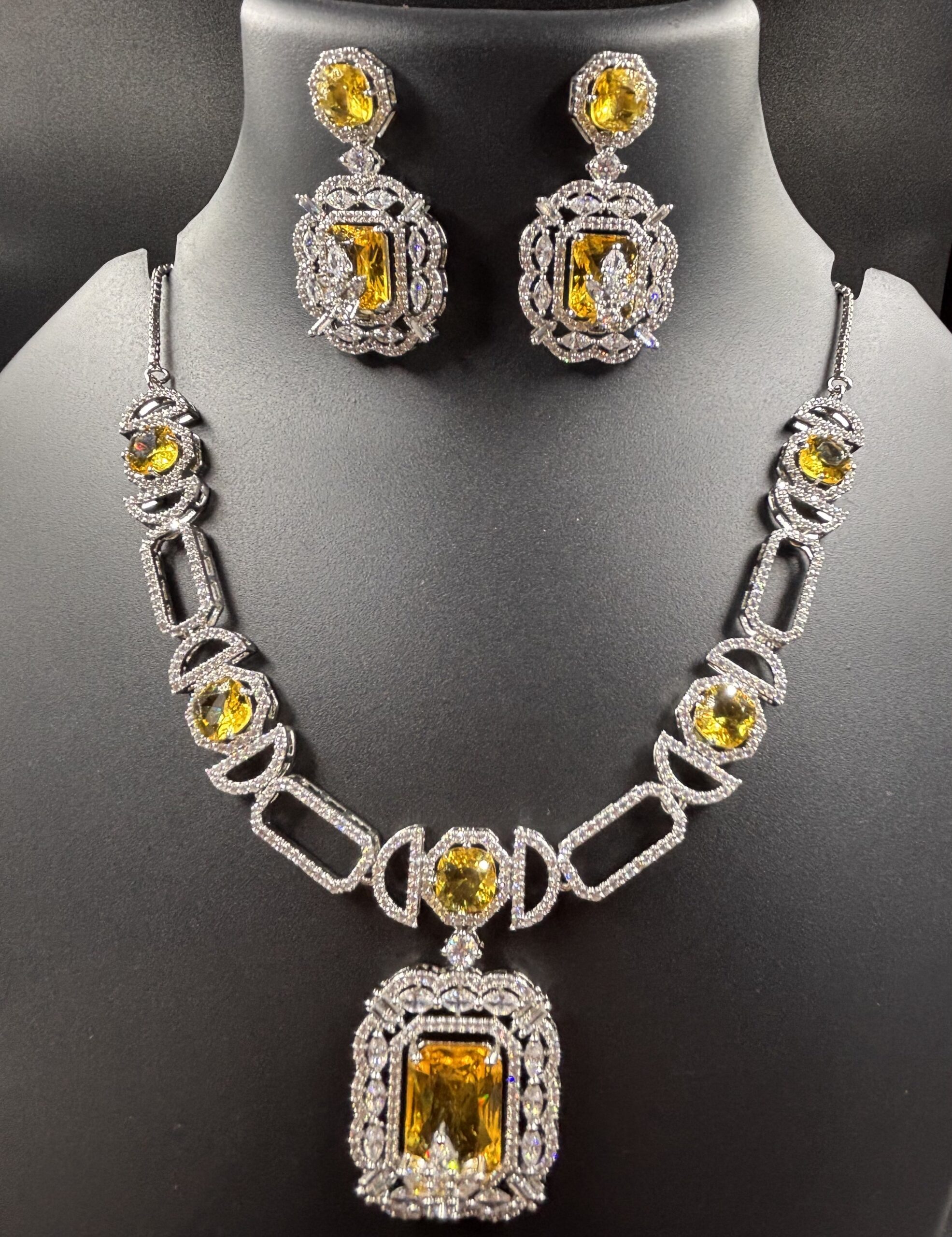 Be the first to review “Silver-Tone Yellow Stone Regal Cutwork Pendant Necklace Set”