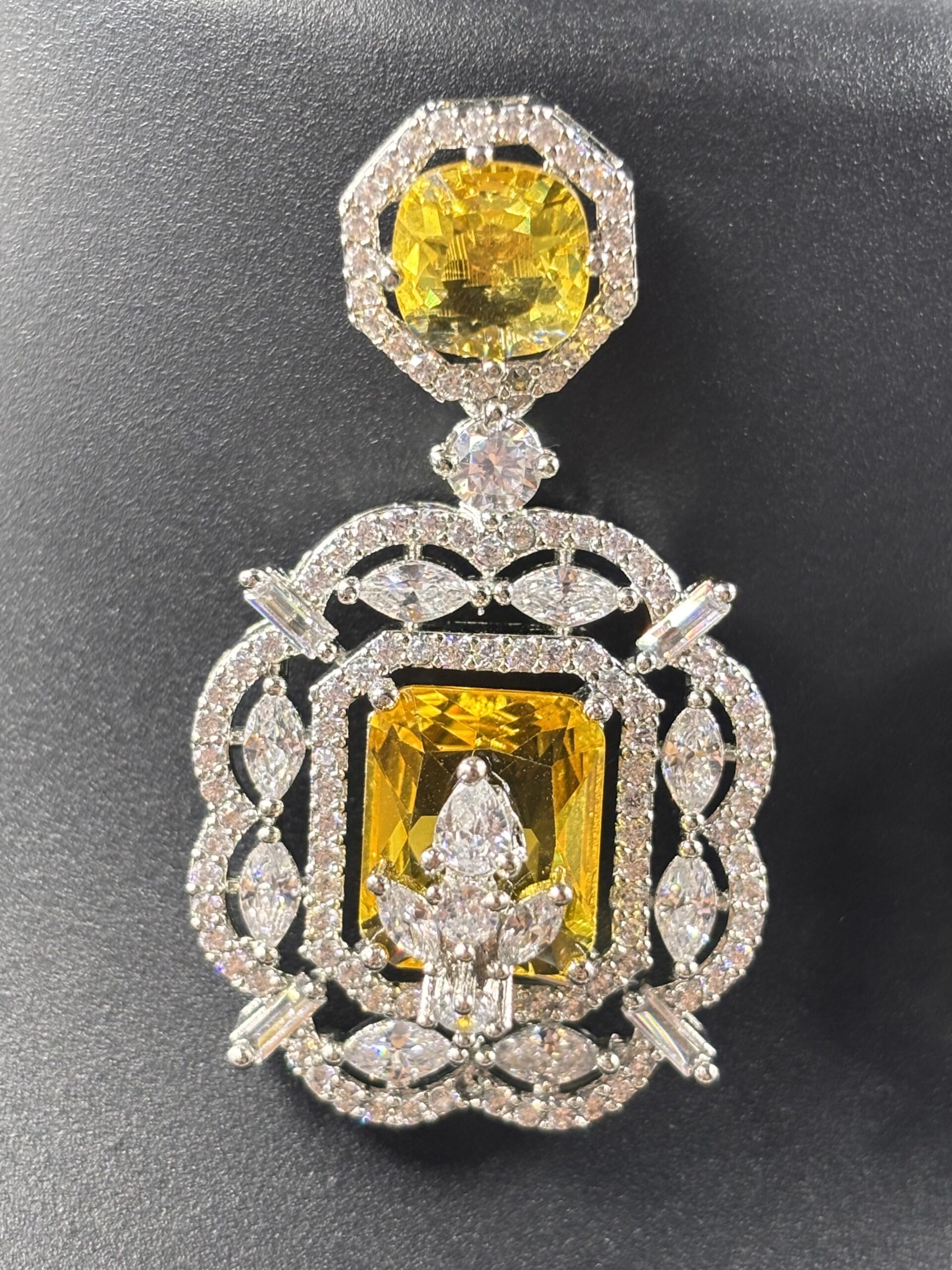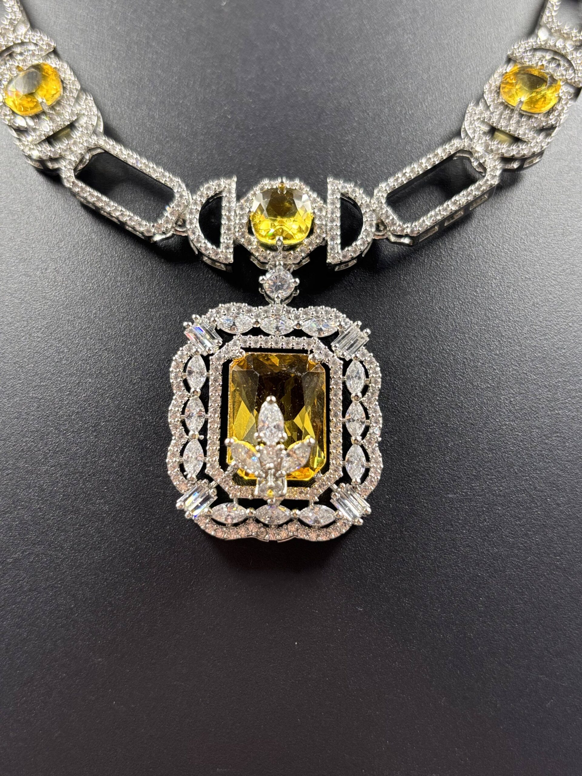 Make a bold and elegant statement with this Silver-Tone Yellow Stone Regal Cutwork Pendant Necklace Set. Designed with a sophisticated geometric chain pattern, the necklace features radiant oval and rectangular-cut yellow stones framed by intricate crystal-studded cutwork, culminating in a grand statement pendant.