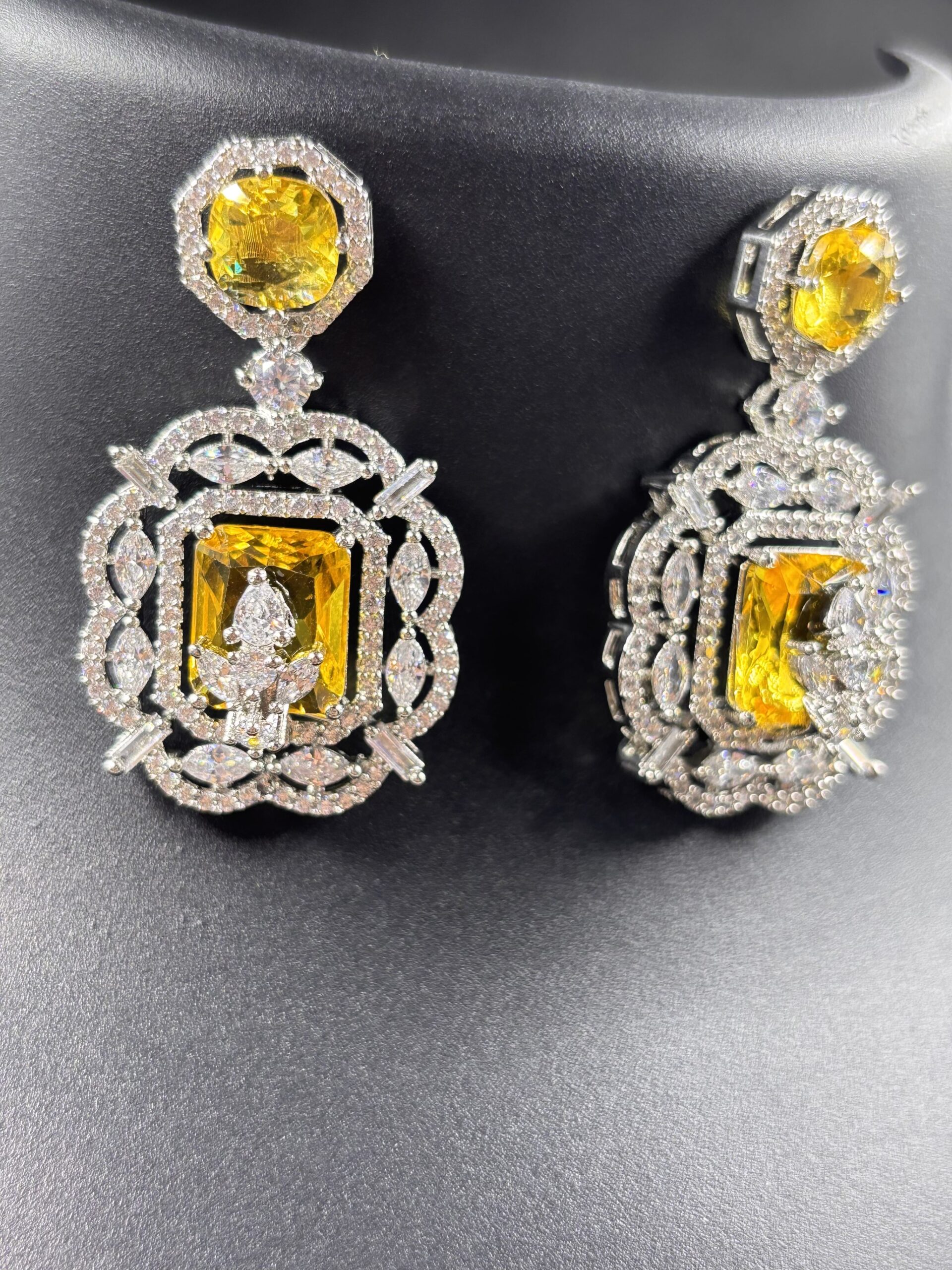 The centerpiece pendant showcases a striking rectangular yellow stone, surrounded by ornate openwork detailing and shimmering crystal accents that add depth and brilliance. Paired with matching drop earrings featuring coordinating yellow stones and delicate crystal borders, this set delivers a harmonious and luxurious look.